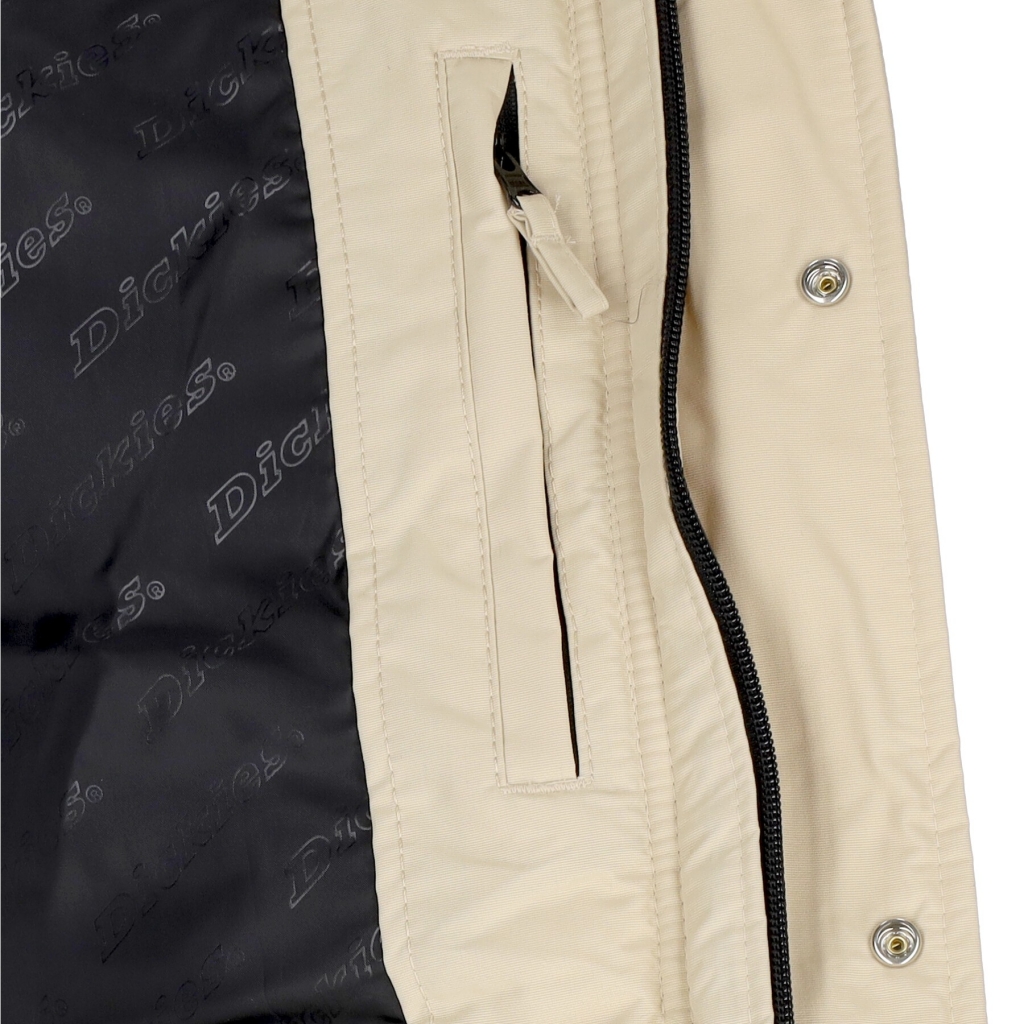 Piumino in tessuto idrorepellente, cappuccio rimovibile, collo alto e chiusura con zip e poussoir